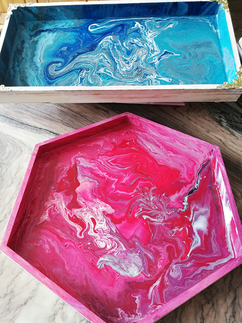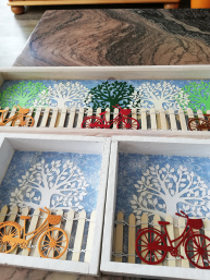 Schlüsselanhänger "Baum des Lebens" mit Spruchkarte, Tabletts und Shadowboxen mit Motiven und Pouring-Verfahren.